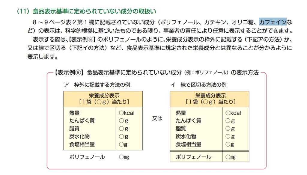 さらに、食品表示基準でも、「カフェイン」は表示義務のない栄養成分です。