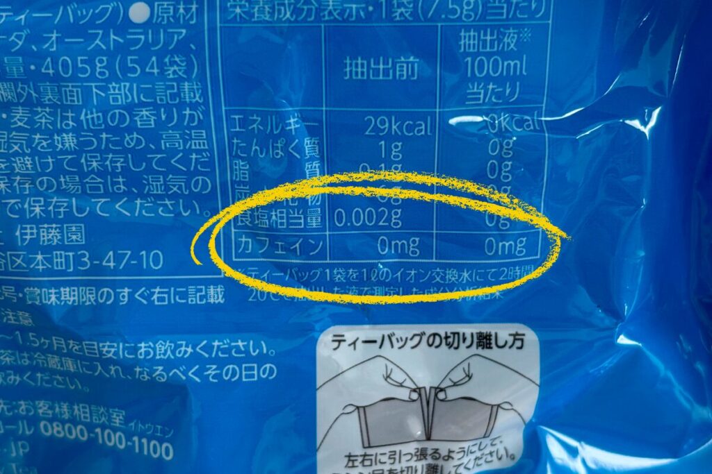 明確に「カフェインが入っていない」ことをPRしたい商品では、栄養成分表示に「カフェイン 0mg」と明記されている商品もあります。