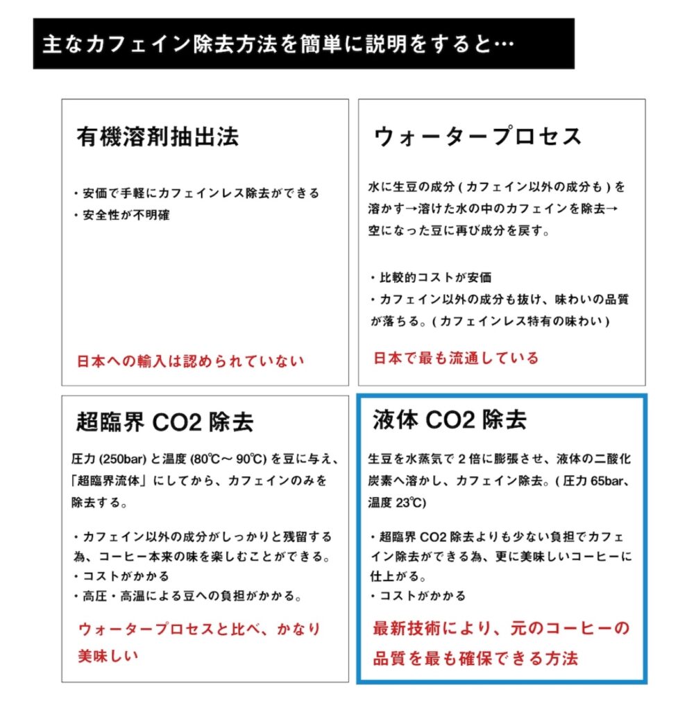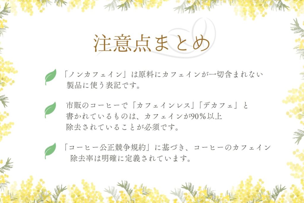 - 日本では、カフェインを90%以上取り除いたものが「カフェインレス」や「デカフェ」と表示されます。