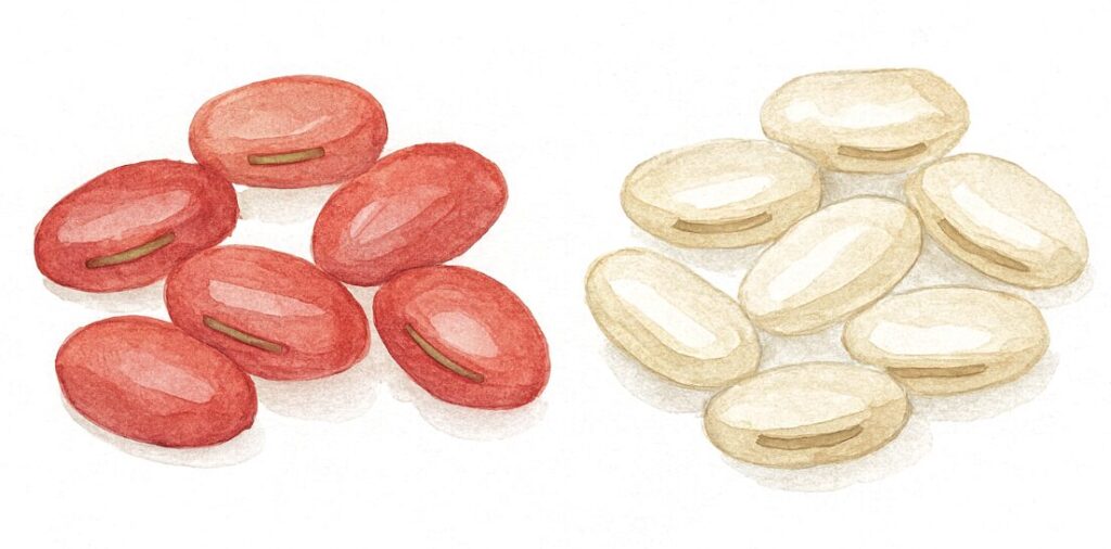赤なた豆はやや香ばしさが強く希少ですが、成分や健康効果はほぼ同じとされています。